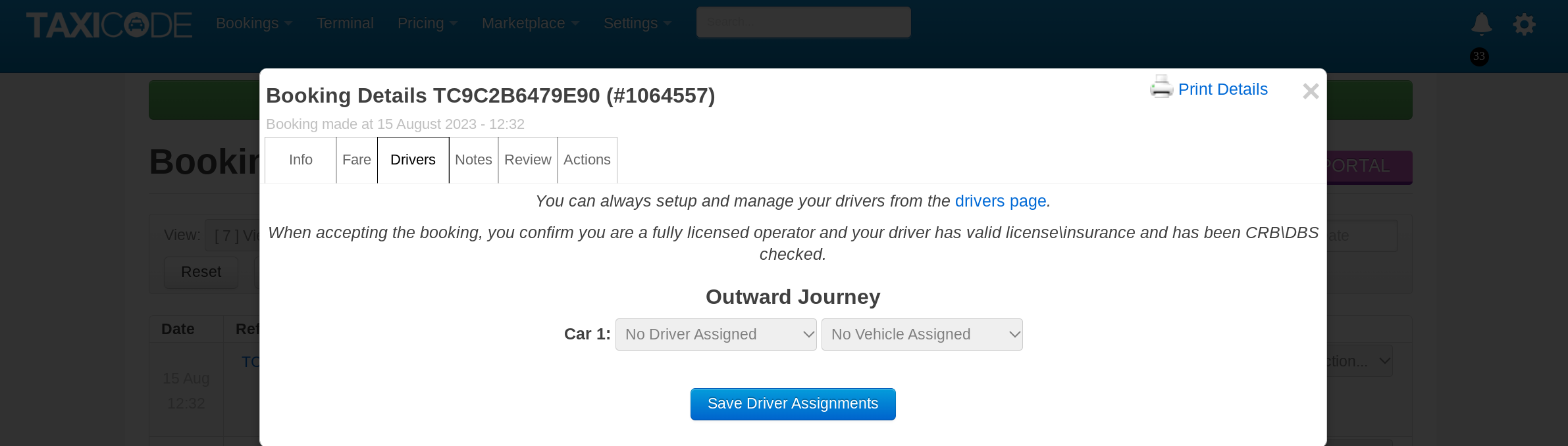 If you have chosen to assign a driver and vehicle at a later date, this can be done by opening the bookings and selecting the "Drivers" tab. From here, you will be able to select the driver and vehicle of your choice. Once this has been done the allocated driver will receive an email and their Taxicode drivers portal will be updated with all the necessary journey information. The passenger will receive an email informing them that a driver has been allocated to their journey along with all the driver's details.